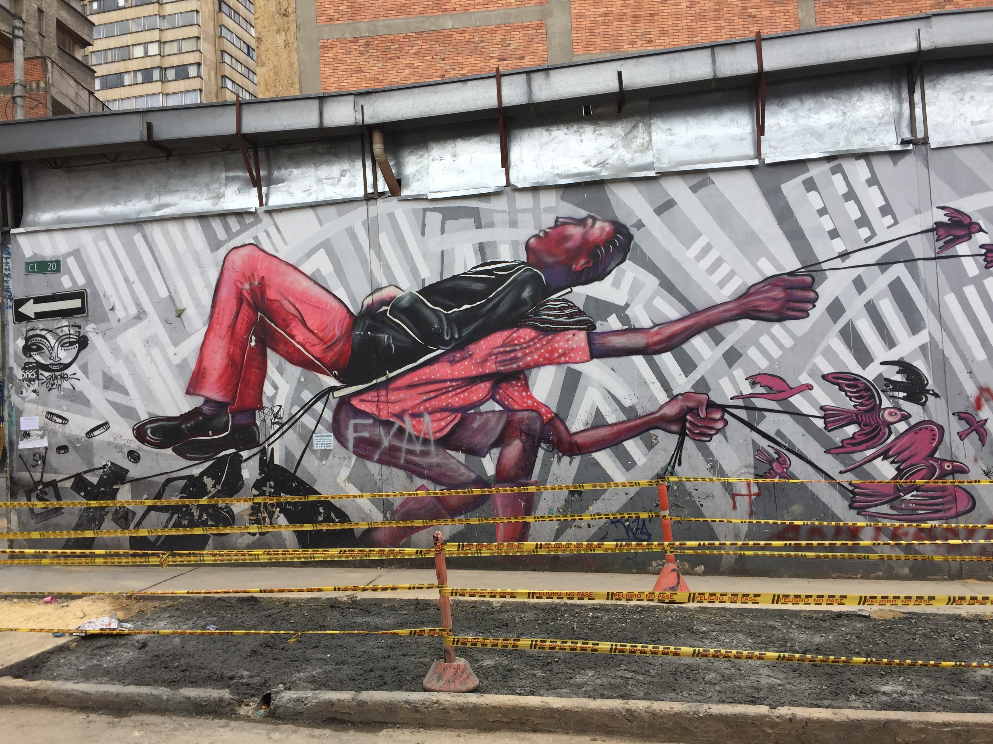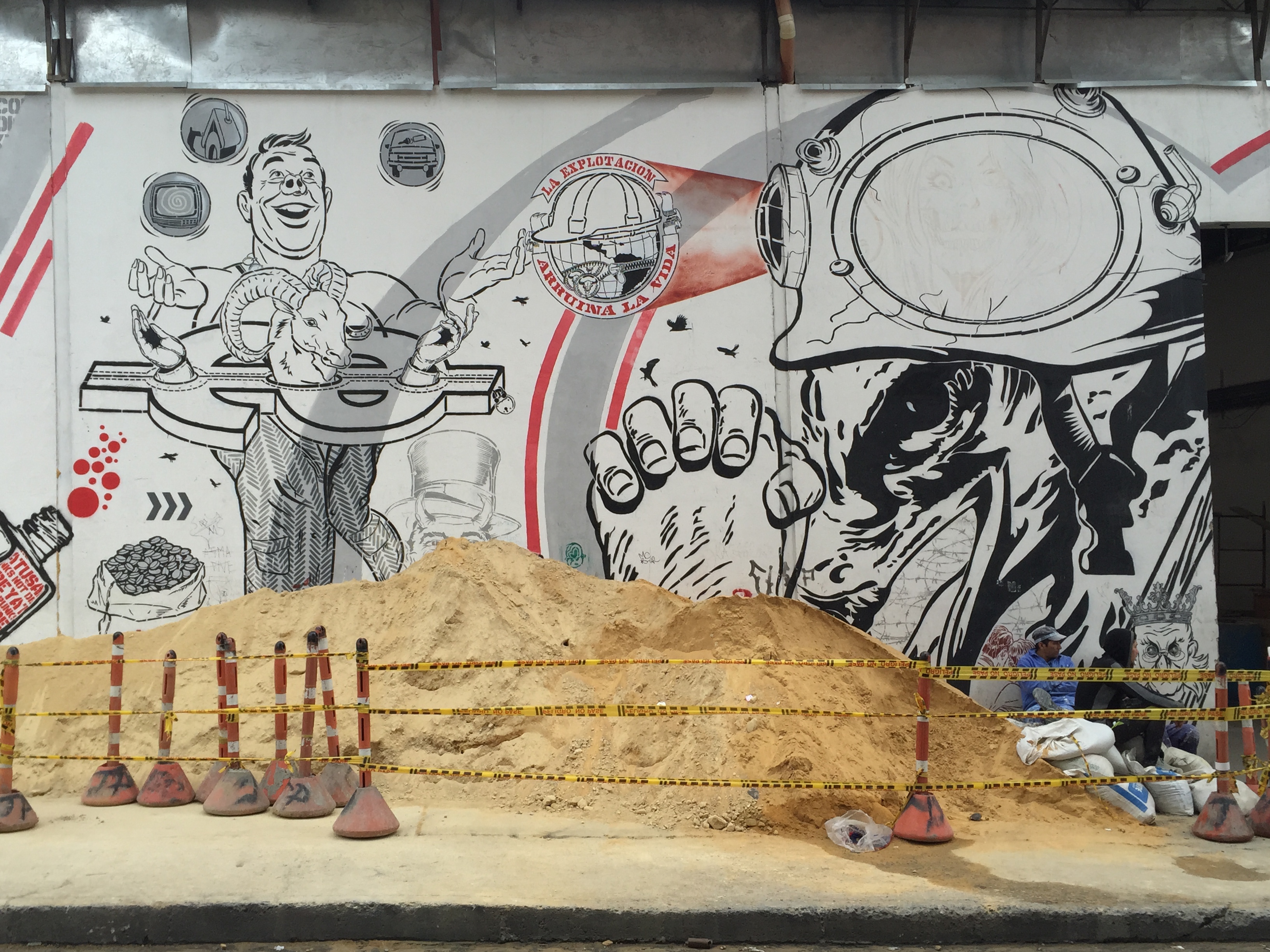 The legacy of La Violencia and the perils of capitalism come through most forcefully at a construction site far from La Candelaria. Here, a mammoth triptych by Guache, Toxicomano and DJ LU brims with cautionary slogans such as “Exploitation ruins life” and DJ LU’s “pineappleade” icons. “Piña” means “pineapple,” but it’s also slang for “grenade.”